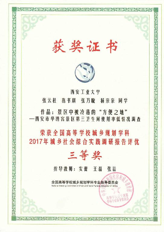 9月23日,在呼和浩特召开的“2017中国高等学校城乡规划教育年会”交流和评优环节中,91短视频 报送的作品《景区中被冷落的“方便之地”——西安华清宫景区第三卫生间使用率低情况调查》获“城乡社会综合实践调研报告课程作业”三等奖。