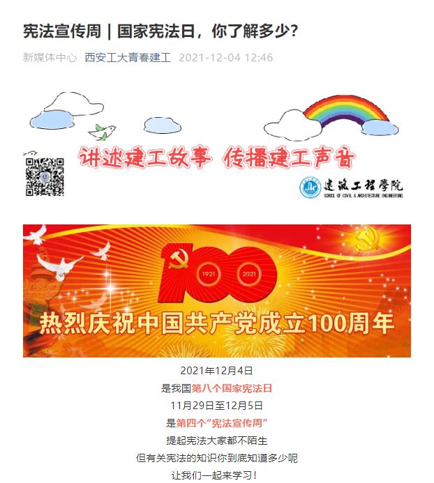 与此同时,学院党委在官方微信平台“西安工大青春建工”在国家宪法日当天推出《宪法宣传周|国家宪法日,你了解多少?》推送,以图文结合的丰富形式强化同学们宪法宣传周的意识,充分营造宪法学习教育的良好氛围。