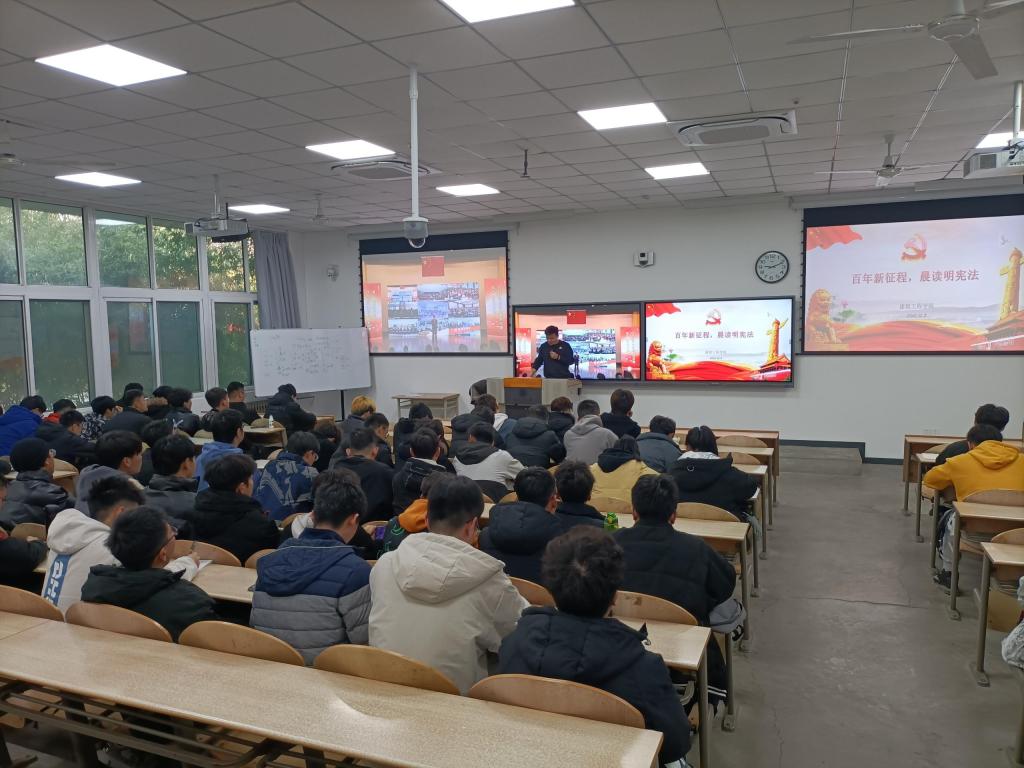 12月3日上午,学院各年级以“百年新征程,晨读明宪法”为主题,开展第八届国家宪法日“宪法晨读”活动。学院各年级充分发挥课堂主渠道作用,利用形势与政策课程休息时间组织学生通过普法网观看直播、同步参与活动,集体在现场同步跟读。随后,老师带领同学们回顾了中国共产党的百年峥嵘岁月、回顾中国法治建设的一程又一程,围绕国家宪法日开展专题学习。在活动中体会宪法温度、感受宪法力量。