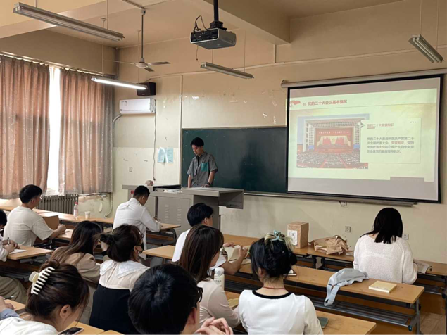 党课伊始,王岩带领全体党员一起深入学习了习近平新时代中国特色社会主义思想和党的二十大精神,全体党员深刻领会了党在过去五年的工作成果和新时代十年的伟大变革,深刻领会新时代新征程党和国家事业的重大战略部署,深刻领会坚持党的全面领导和全面从严治党的重大部署,让同学们对党的二十大精神了解更加深入。