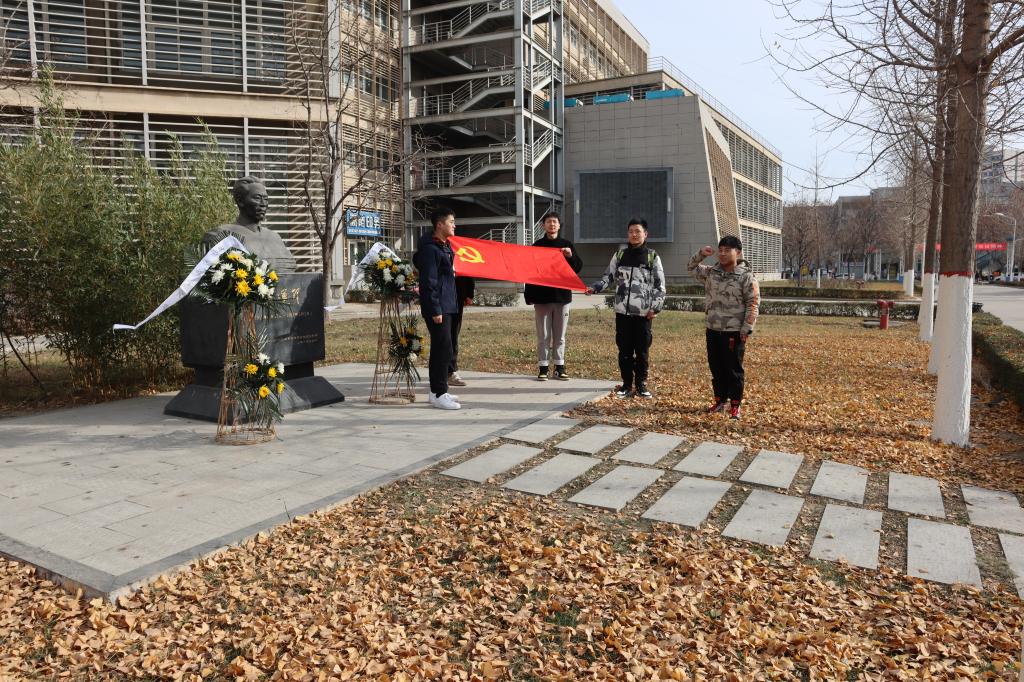 料峭寒风中,英雄雕像傲然独立。20余名师生党员面向吴运铎雕像前肃立致敬。党员们缓步走向吴运铎雕像,代表学院师生敬献花篮,并整理花篮缎带, 向英雄深情鞠躬,垂首默哀。学生党员董嘉宏诵读《把一切献给党》中的“入党”章节,通过重温经典形式深入学习兵工英雄吴运铎同志迎难而上、在党和人民需要的时候挺身而出的优良作风。在英雄雕像前,全体师生党员面对鲜红的党旗,高举右拳重温入党誓词,表达出坚定不移永跟党走的决心,彰显了不惧风雨、勇挑重担,为祖国发展和民族复兴贡献青春蓬勃力量的信念。“作为一名西工学子,能够在兵工英雄诞辰这个特殊的日子里阅读分享红色经典,深入了解吴运铎同志坚守初心、对党和人民极度忠诚的感人故事,极大地激发了我们青年一代坚定理想信念、争做新时代的奋进者、开拓者、奉献者的使命感与责任感。”学生党员贺毓激动地说。支部书记何鹏程表示,青年党员要学习弘扬吴运铎同志始终对党、对祖国、对人民绝对无限忠诚的精神品质,练就过硬本领,进一步传承发扬西工精神,勇担时代使命,将小我融入大我、以青春奉献祖国。