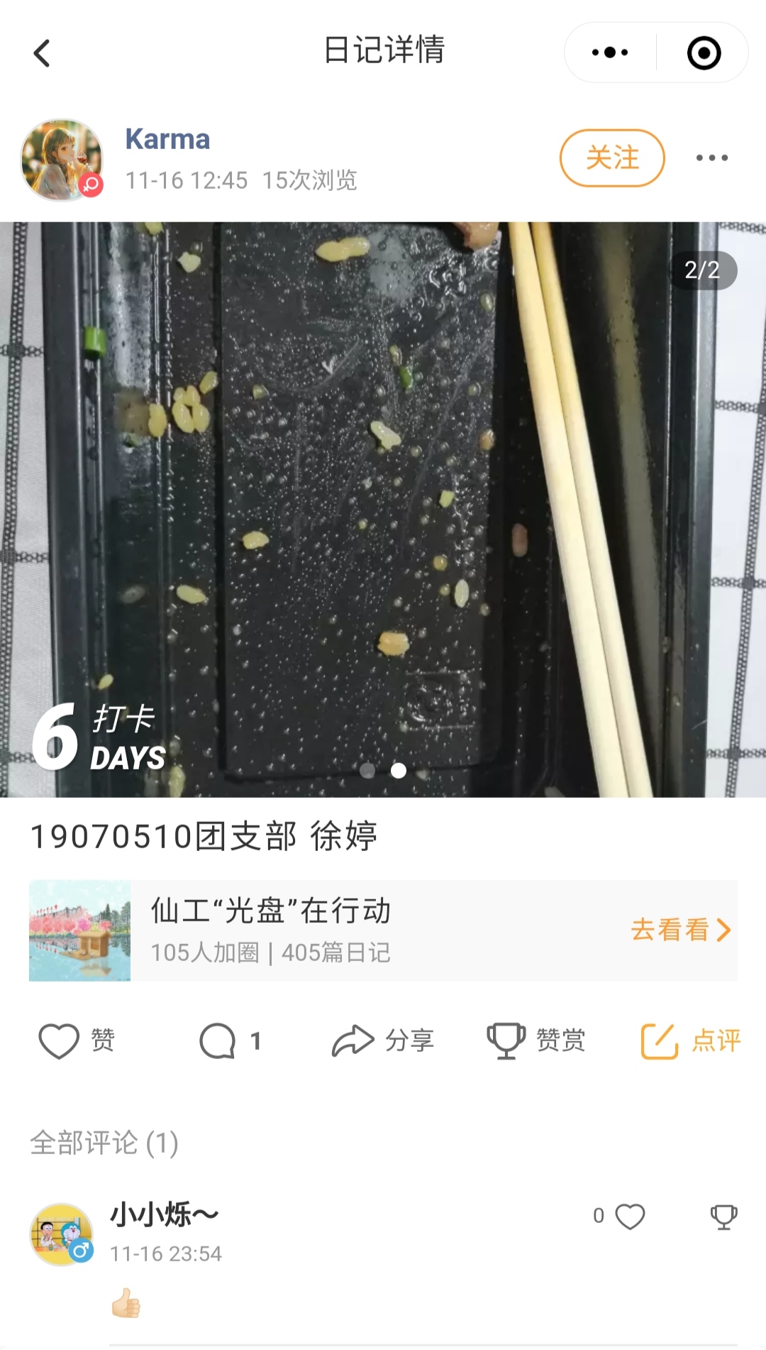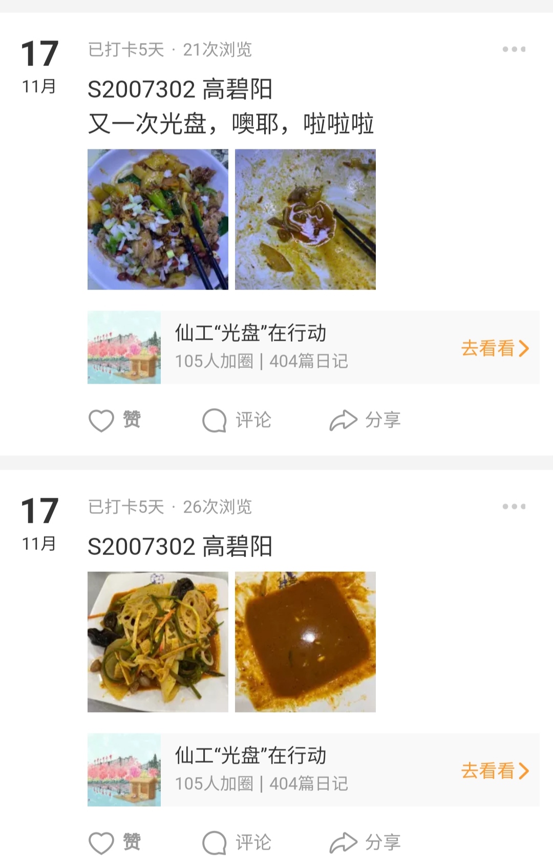 团委于11月中旬在全校范围内组织团员青年开展了“仙工‘光盘’在行动”每日打卡主题团日活动。