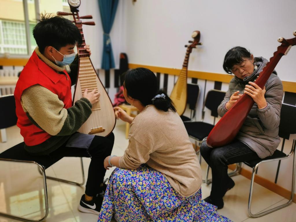 “转轴拨弦三两声,未成曲调先有情”,九零后琵琶老师钟老师亲切地向居民讲述了琵琶的历史发展,耐心地教授乐理知识,休息之余演奏了悠扬的曲子,展示了精湛的琵琶技艺,经过上午的学习,没有音乐基础的居民已经了解了指法、弹奏简单的曲子了。