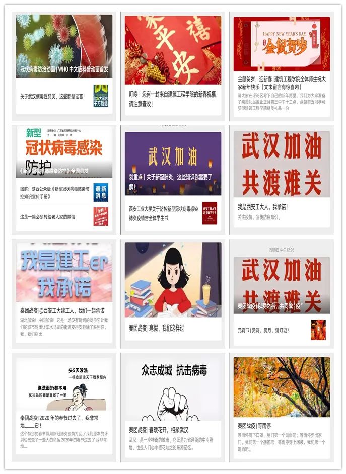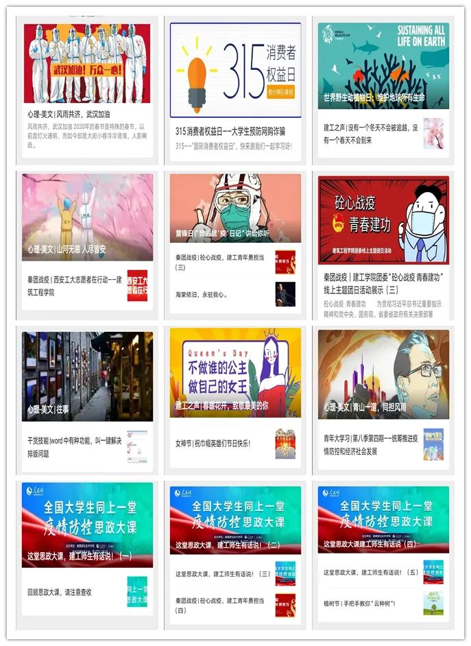 充分利用新媒体平台“西安工大青春建工”,通过“建工之声”、“心声有约”、“书香建工”、“砼心战疫”等栏目,集中展示学院师生参与疫情防控工作的点滴记录;重点依靠学院学生党员、团学干部及新媒体中心学生团队,构筑抗疫在线宣传网,编制学生思想防护服,构建思政育人同心圆,积极展现出建工青年勇于参与疫情防控工作的蓬勃力量与建工声音,切实发挥网络思政育人的实效性。