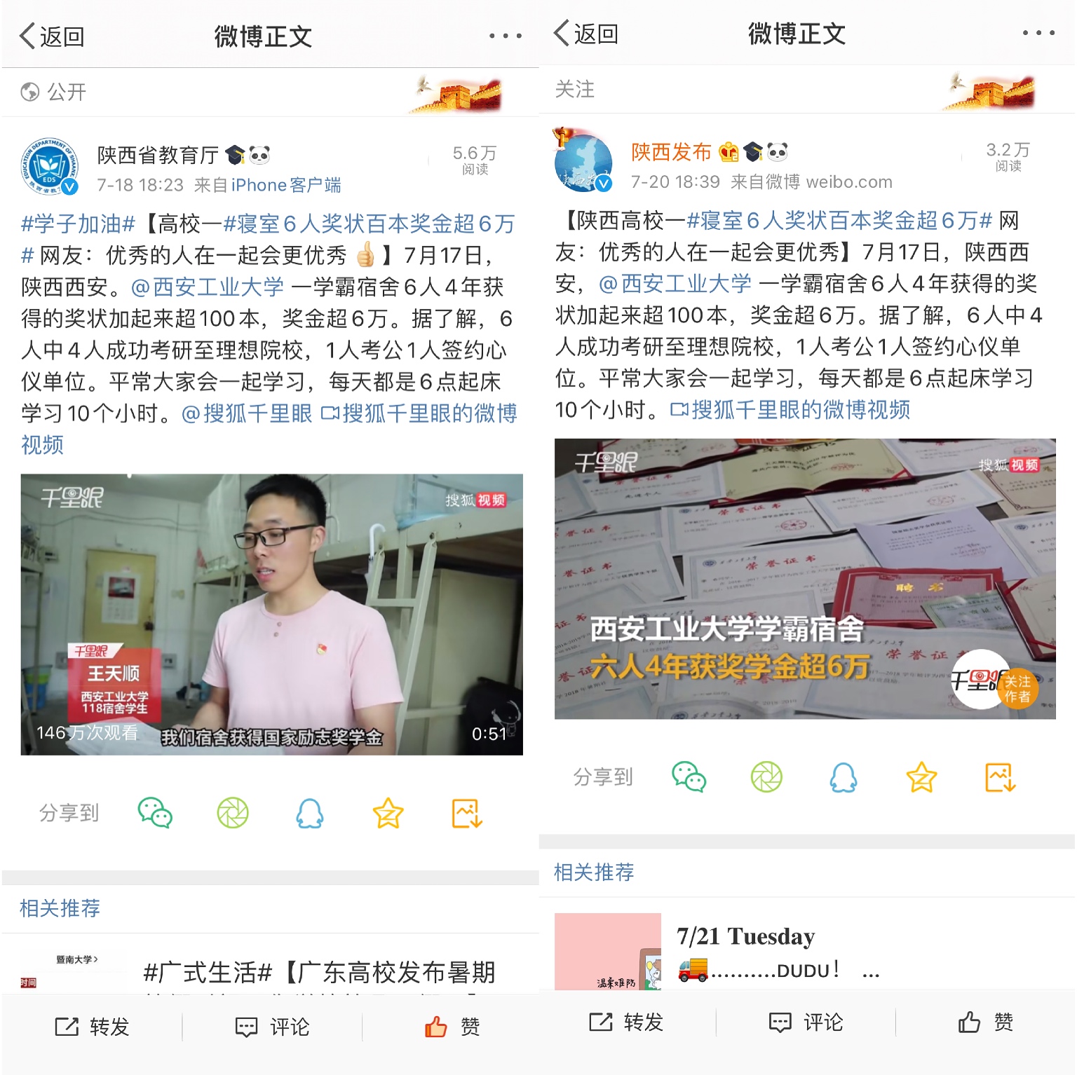 118宿舍的学霸事迹被广泛报道,受到多家媒体关注。陕西发布、陕西省教育厅、中青网、西安发布、搜狐新闻、网易视频、三秦青年等官方媒体对该消息进行转发报道,截止21日中午,该话题微博阅读量已达到1043.6万,讨论数超过4000,引起强烈反响。