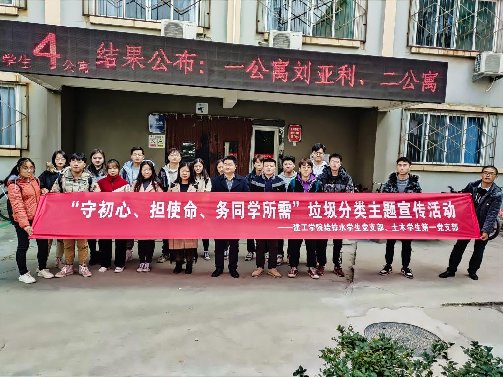 土木学生第一党支部联合给排水学生党支部在学生公寓开展了以“守初心,担使命,务同学所需”为主题的垃圾分类主题党日活动,号召学生党员争做垃圾分类的宣传者、倡导者、推广者。