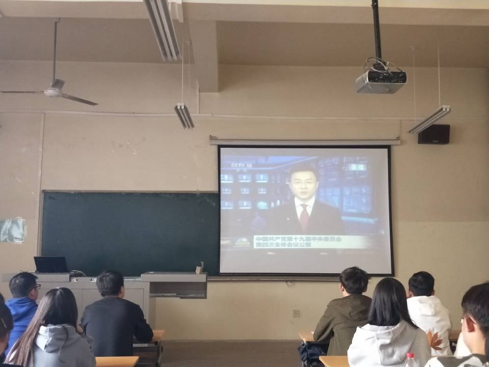 会上,刘老师着重讲解了十九届四中全会提出的十三个“坚持和完善”,并指出党的十九届四中全会是在新中国成立70周年之际,“两个一百年”奋斗目标的历史交汇点上,召开的一次具有开创性、里程碑意义的重要会议,坚持和完善中国特色社会主义制度、推进国家治理体系和治理能力现代化的总体目标逐步实现。全面把握、深刻领会四中全会精神实质,围绕“坚持和完善中国特色社会主义制度、推进国家治理体系和治理能力现代化”这一重大命题,切实把思想和行动统一到四中全会精神上来。随后,团学干部统一观看中国共产党第十九届中央委员会第四次全体会议视频,同学们聚精会神地观看,了解了十九届四中全会的要求。