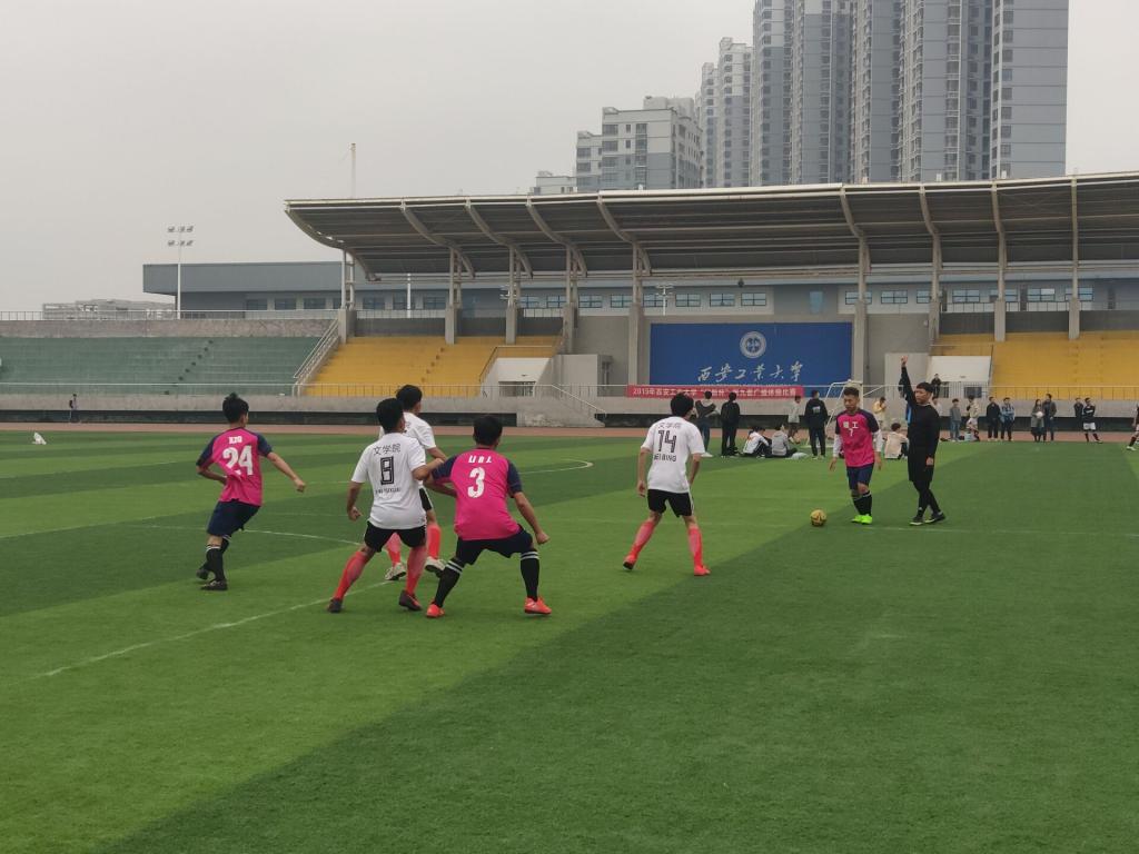 比赛伊始,各位参赛队员做好了赛前热身准备。随着裁判开始的哨声,激烈的比赛便拉开了帷幕。前期由于双方球员不是很了解对方,因此都打得比较保守,处于试探性阶段。随着双方对彼此球风的了解,比赛开始激烈起来,双方球员也渐入佳境,不时打出精妙的配合和有威胁的射门。学院的队员们无论是抢球还是传踢,气势凌厉;可是对方的选手们也功夫了得,进攻、防守,不慌不忙。场外学生也激情洋溢,纵情地为队员们加油、叫好,现场气氛十分热烈。对手间的隔阂在场上已荡然无存,有的只是飞扬的步伐和矫健的身姿。虽然天公不作美,但每个球员都毫不示弱,尽情展示团队的热情与默契。场上时时高潮不断,观众连连欢呼叫好。足球场就在比赛进行中一点点升温,感染着在场的每一个人。