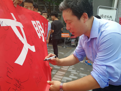 同学们深入食堂主动宣传,以身作则,清理餐盘并号召大家文明就餐。中午用餐人数较多,学院团委同学引导大家有序排队,并倡议广大师生就餐结束后及时将座位让给有需要的人。此外,大家还准备了文明就餐宣传展板和横幅标语,带动老师与同学们共同参与活动,并让大家在标语横幅上签下自己的名字,承诺从自身做起并不断带动周围人群做到文明就餐。活动现场非常热烈,老师和同学们对文明就餐问题都十分看重,大家积极参与。醒目的红底白字也警醒着我们粮食的不易、提醒着大家文明就餐的重要性。