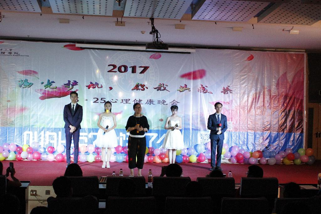 的传统活动,它不仅是一场师生的盛会,更是一场别具特色的心理主题晚会。随后,在炫彩舞灯的映衬下,主持人宣布晚会正式开始。动感而又时尚的《鬼步舞》表演使晚会的现在的气氛立刻热烈起来,一首深情的歌曲《凉凉》缓缓入耳,让我们感受到了爱情的虔诚。跆拳道表演总是那么激动人心,迎来一阵阵的掌声;大二学长的一首《董小姐》,更是让人感受到歌手宋冬野对爱情的那般用心。心理剧《心门》使台下的同学们不禁反问自己:我的大学完美吗?中场游戏师生互动,将晚会气氛推向高潮。随后的心理剧《成长心路》,让我们在心灵方面都很受触动,最后由30人组成的手语团队为大家带来的《仰望星空》更是本次晚会的压轴之作,伴随着同学们的手语表演,在座的师生都点亮手机,和着音乐声一起挥舞,晚会现场星星点点的灯光交相辉映,宛若星辰,最终晚会随着音乐的结束圆满落幕。
