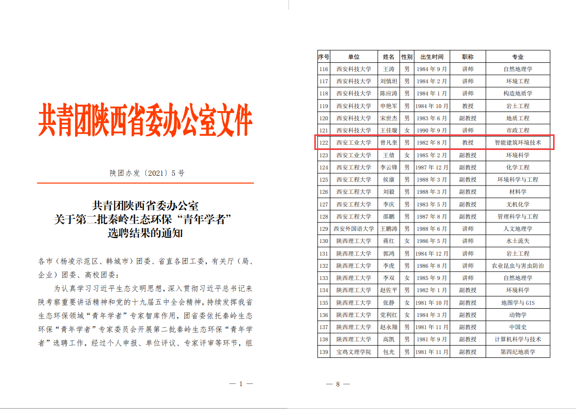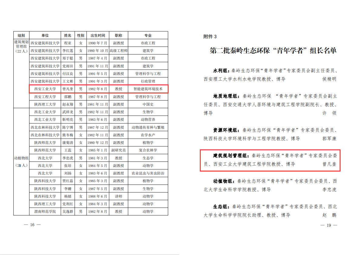 青年教师曾凡奎继2019年被选聘为首批秦岭生态环保“青年学者”后,再次入选并担任建筑规划管理组组长。