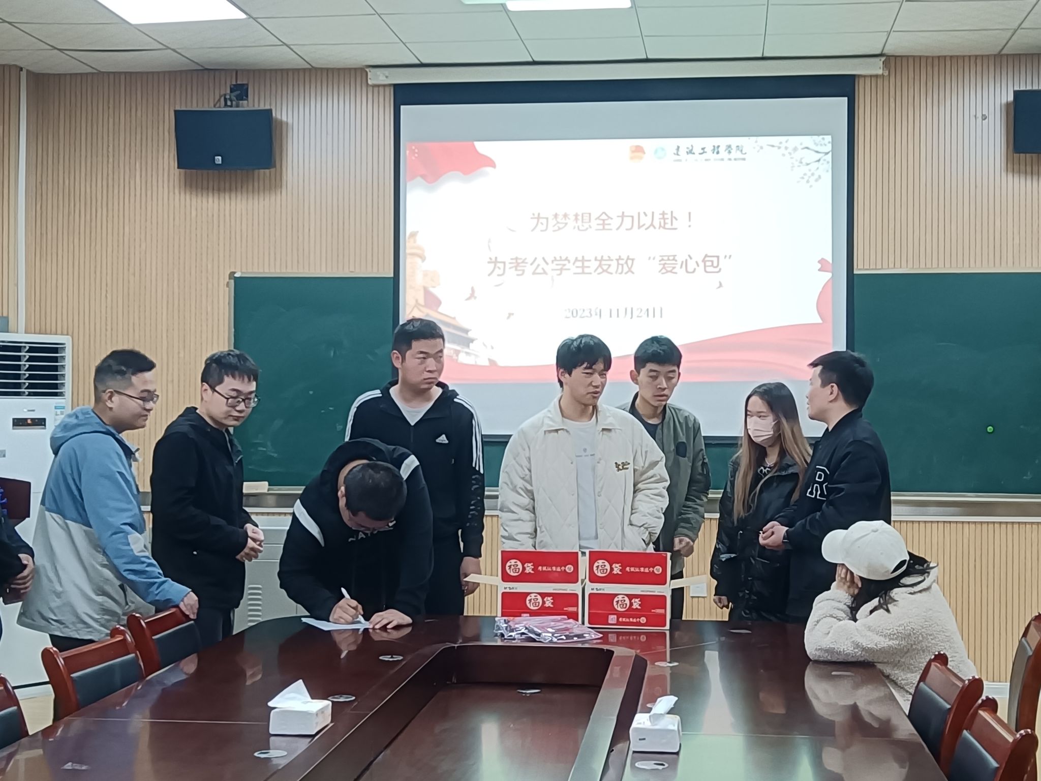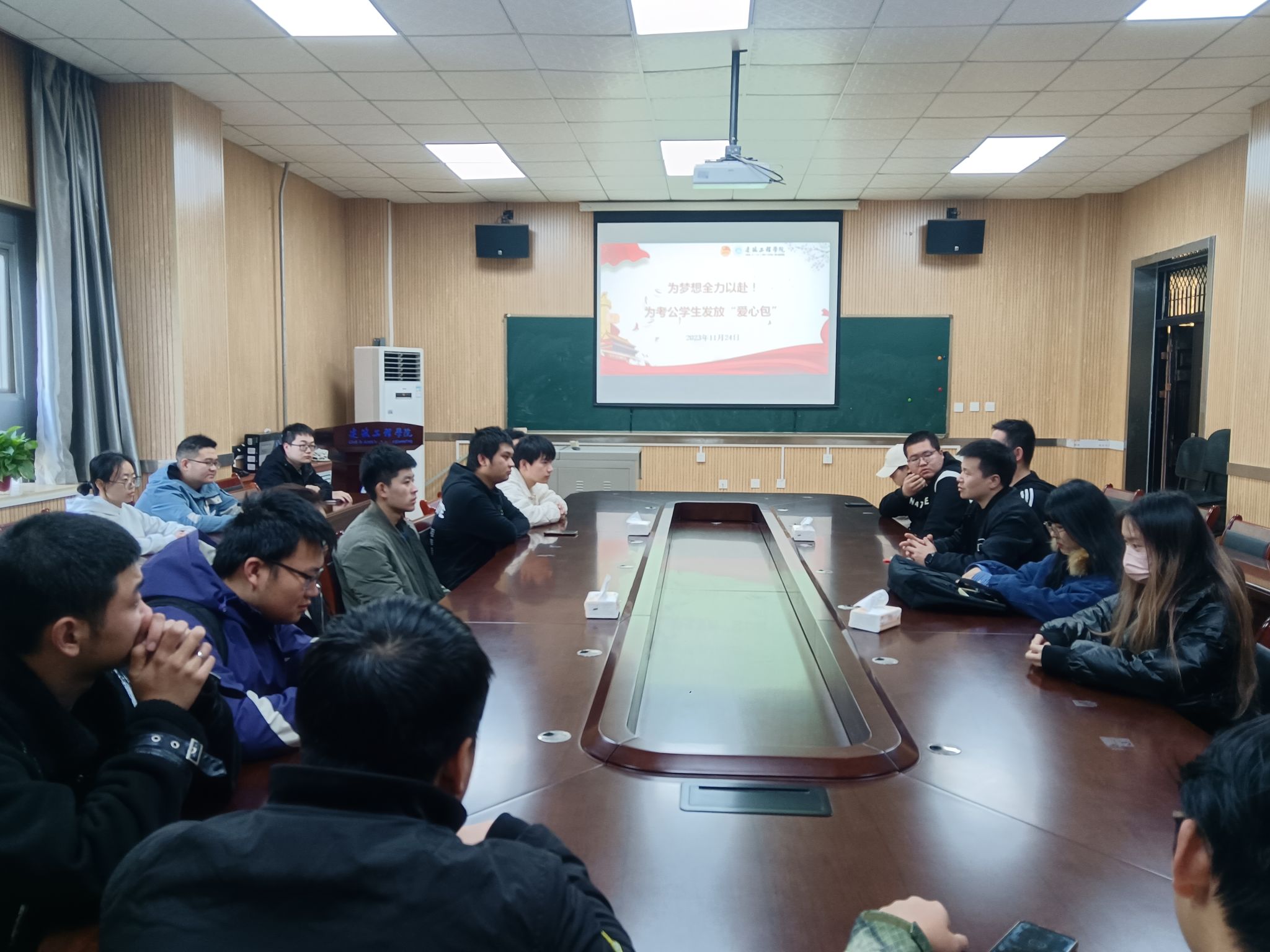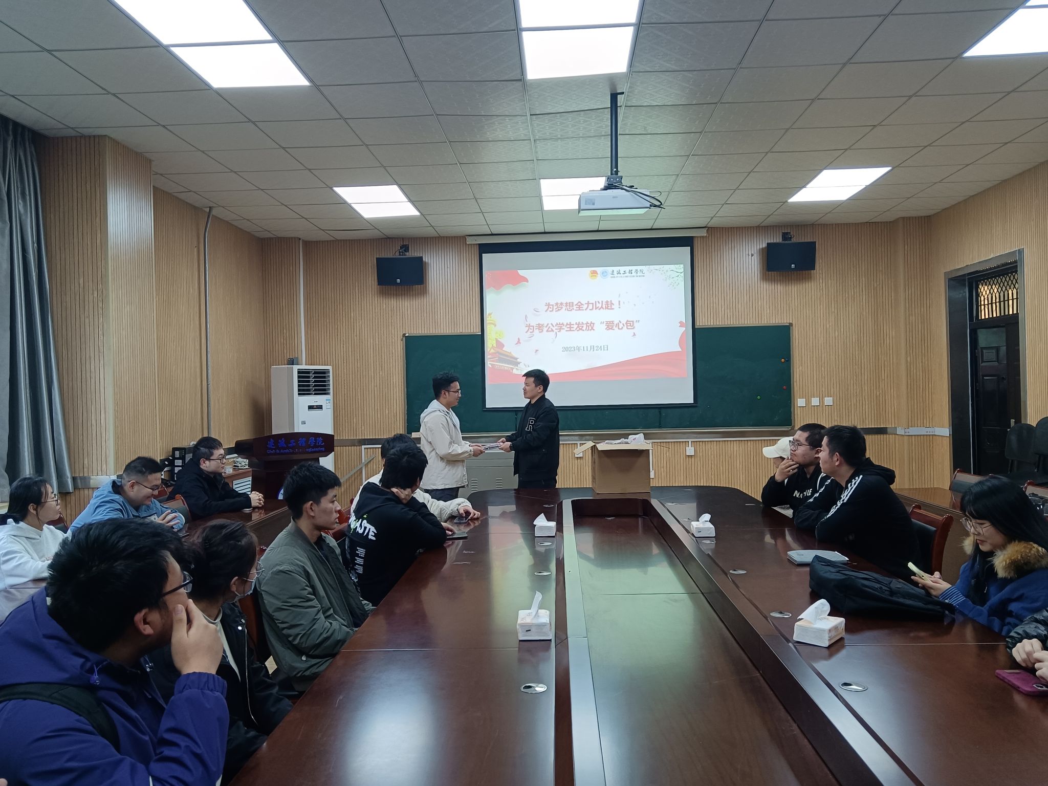 为帮助考公学子调整心态、舒缓心情,营造共同拼搏的学习氛围,11月24日,建筑工程学院在教4-202会议室开展“建工护航,一战上岸”主题考公送温暖活动,毕业班辅导员刘冬代表学院为学院备考国家公务员考试的学子送上35份助考“爱心包”。