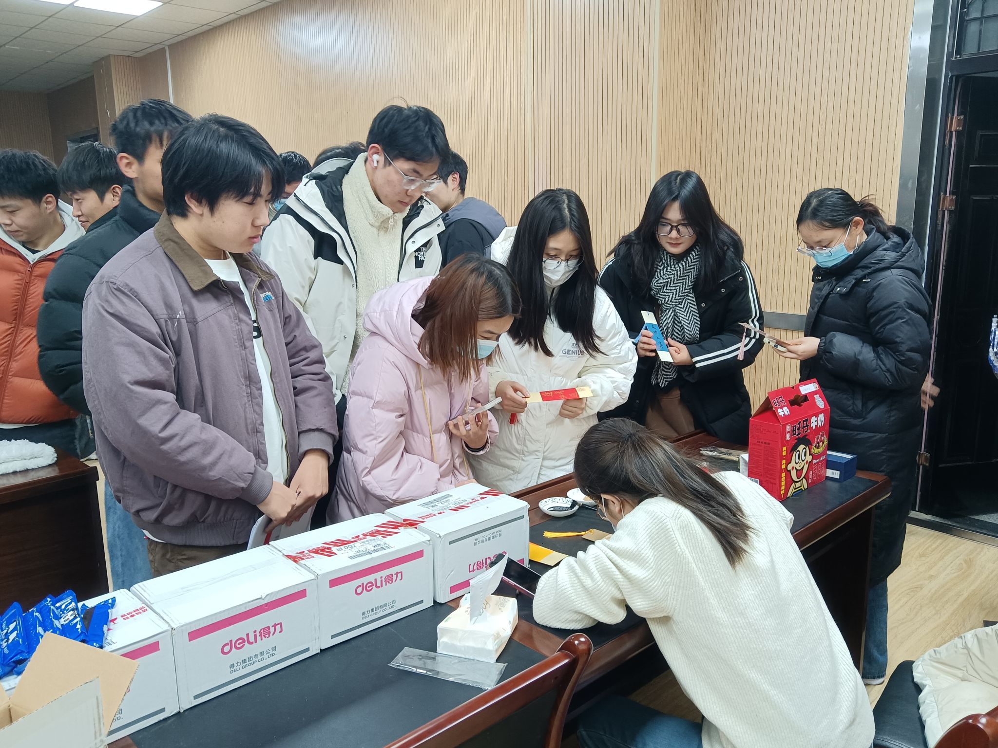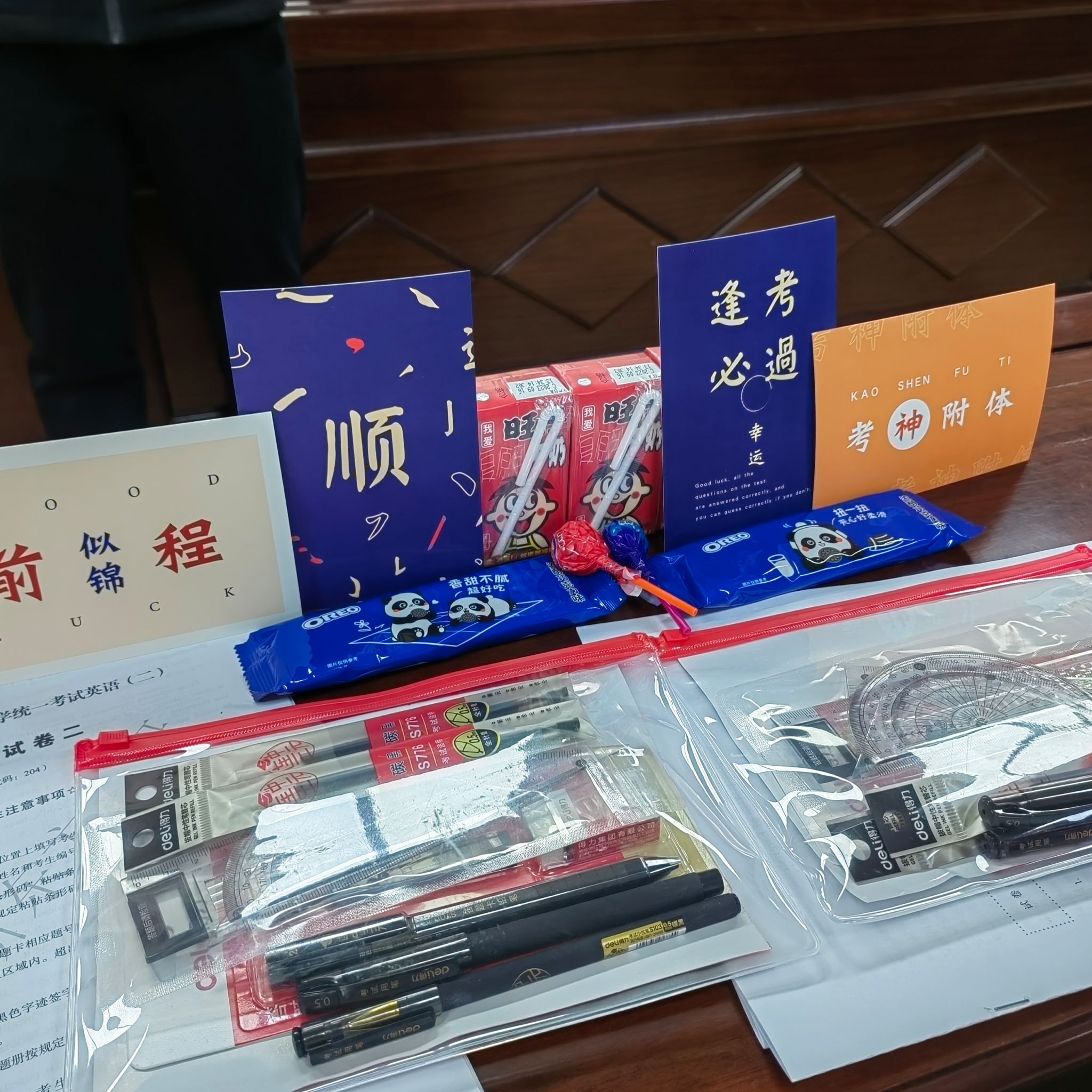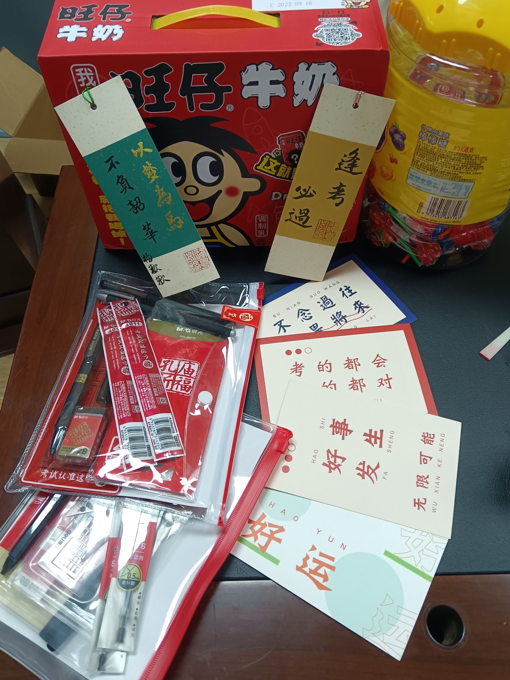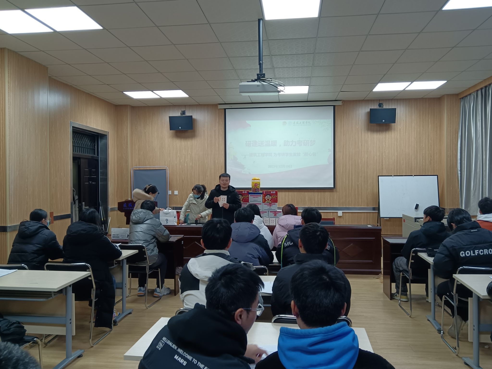 在教4-201会议室开展“情暖初冬,研途有你”主题考研送温暖活动。毕业班辅导员刘冬代表学院为2024年研究生考试学生送上100余份“上岸加油包”。“上岸加油包”内含文具套装、棒棒糖、旺仔牛奶、奥利奥饼干、手写祝福卡等,活动现场,学院教师为考研学子执笔落纸,以书签形式写下激励话语,同学们也在祝福卡片上写下对自己和朋友们成功上岸的美好期待。