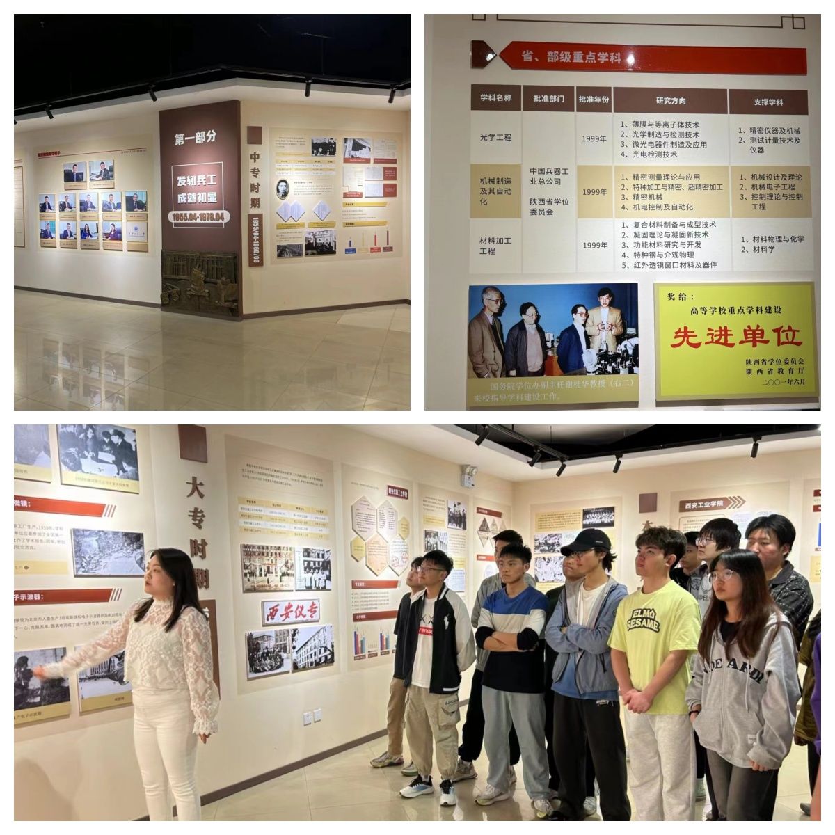我校是以兵工为特色的学校,学校从建校到至今发展规模不断在增大,光电工程、机械制造及其自动化以及材料加工工程等专业也被纳入省、部级重点学科,我校也被评为高等学校重点学科建设先进单位。展馆墙上陈列的众多事迹激起了同学们对于学校的自豪感,对于老一辈西工人的敬佩,感受着老一辈西工人的艰苦奋斗,督促众多学生们艰苦奋斗,唤醒他们努力学习的意识。