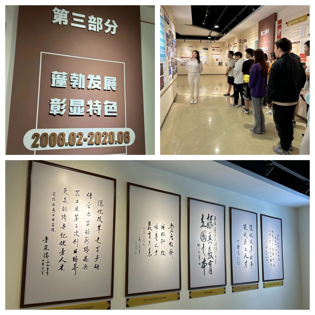 同学们进入校史馆,映入眼帘的首先是我校的发展历程。我校始建于1955年,前身为西安第二工业学校,有着悠久的办学历史和光荣传统。我校始终秉持着“忠诚进取,精工博艺”的校风和“敦德励学,知行相长”的校训,传承着“忠诚进取铸辉煌,精工博艺育英才”的西安工大精神。在办学期间,学校的教育、科研工作均取得了显著的成绩。讲解员为大家深层的讲解学校的发展史,全体成员时而专心聆听,时而交流感悟。随后讲解员为大家讲解了我校的历届领导,同学们聆听讲解员的讲解,深刻感受着老一辈西工人的艰辛和为学校教育事业所作出的无私奉献。