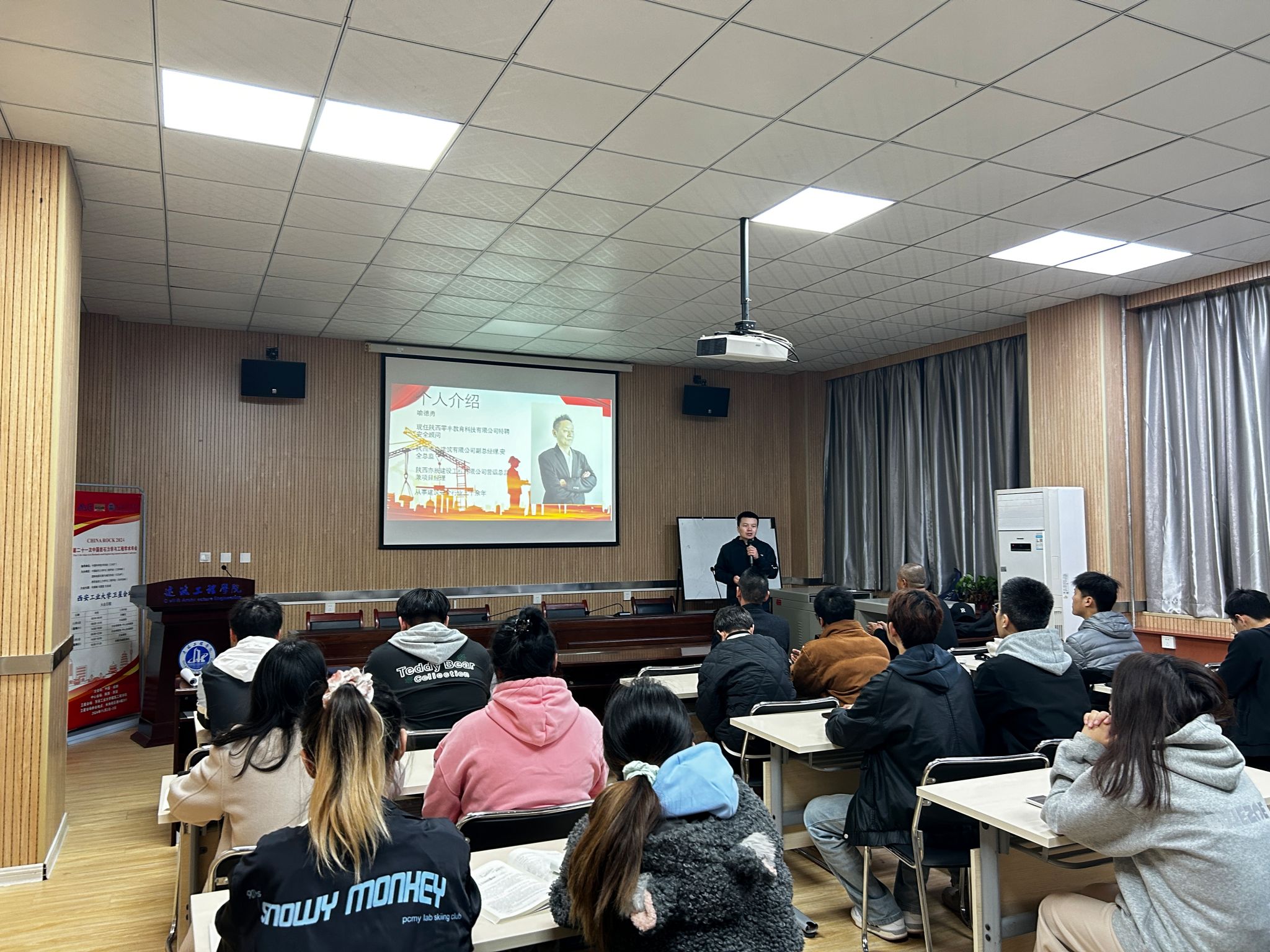 联合陕西零丰教育科技有限公司在教4-201举办安全员职业规划讲座。学工办主任刘冬和50余名学生参加。