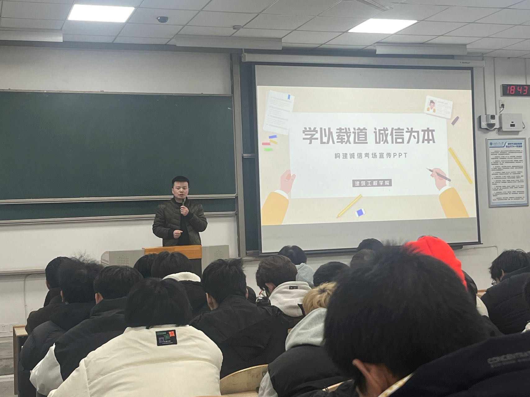 2023级在教1-101教室开展“学以载道,诚信为本”考前诚信教育,辅导员刘冬主持,年级全体学生参与。
