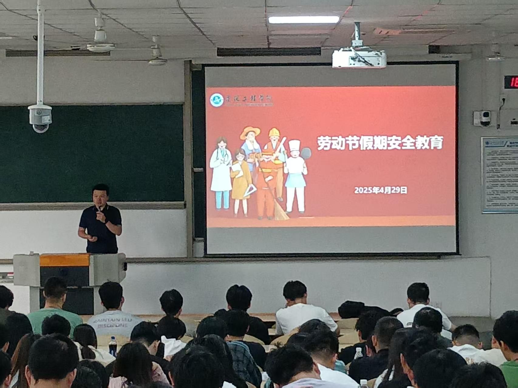 刘冬首先强调:“劳动教育是新时代青年成长成才的必修课,是德智体美劳‘五育并举’的重要一环。同学们要深刻理解‘劳动创造幸福’的内涵,通过实践锻炼劳动技能,培养吃苦耐劳、团结协作的精神,让青春在奋斗中绽放光彩。”其次,他以“劳动精神、劳模精神、工匠精神”为核心,结合专业实习、社会实践、志愿服务等工作,向同学们阐释劳动教育在个人成长、工作实践、社会发展中的重要意义。紧接着,他以五一假期安全教育为主题,围绕交通安全、出游安全、饮食卫生安全、财产安全、人身安全、自我保护、预防电信诈骗等安全问题展开强化教育,提醒留校学生加强宿舍安全管理,重点做好防火、防盗工作,及时排查并消除各类安全隐患。最后,刘冬结合五四青年节,希望同学们坚定理想信念,坚定不移听党话、跟党走,立报国强国大志向、做挺膺担当奋斗者。