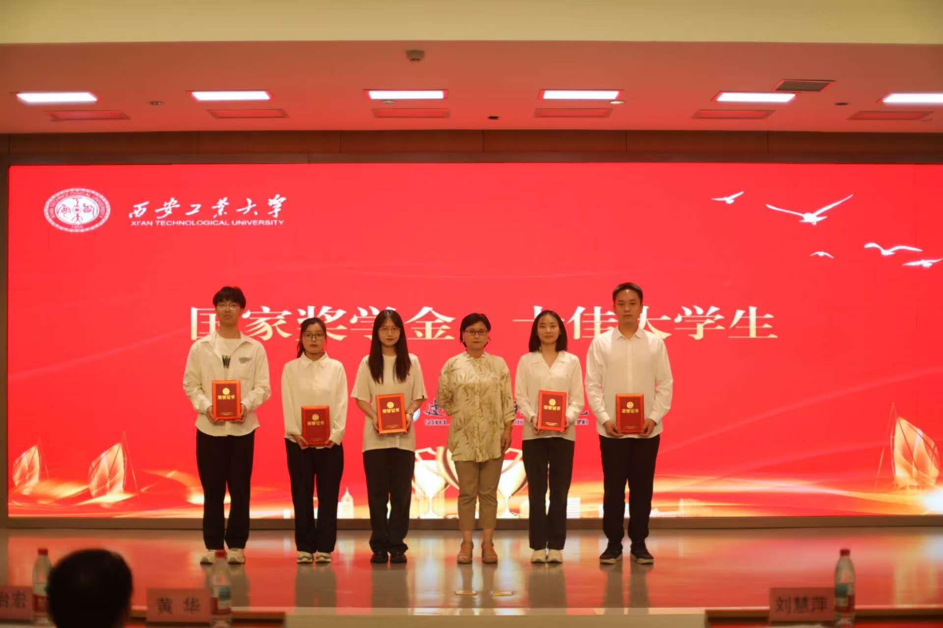 在激昂乐曲声中,获奖代表分十六组依次登台,接受荣誉授予。党委书记刘慧萍为国家奖学金获得者和十佳大学生颁奖;院长黄华为西部基层就业先进个人颁奖;党委副书记贾建利为国家励志奖学金获得者和三好学生颁奖;副院长郭庆军为优秀学生骨干和优秀研究生干部颁奖。