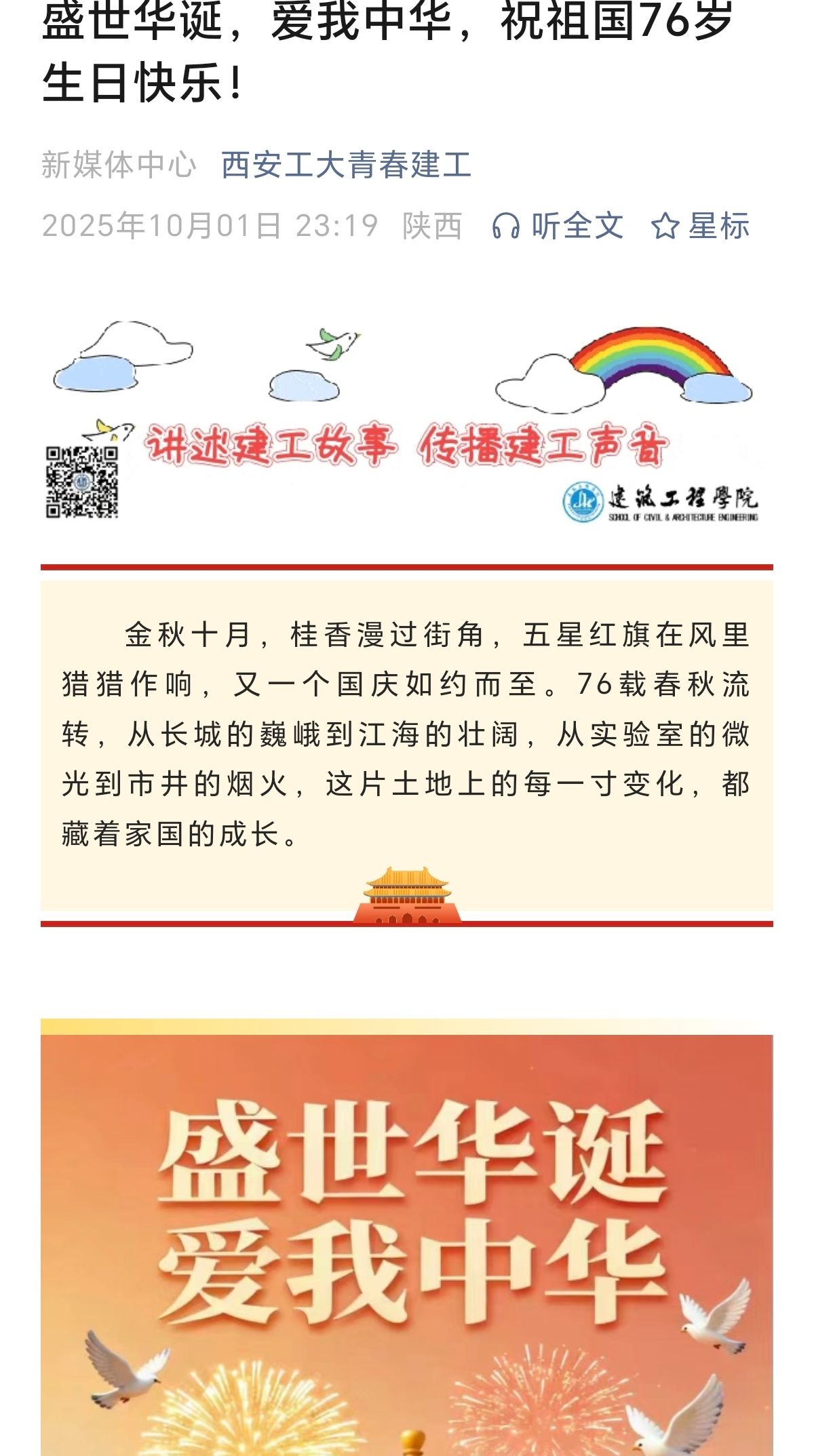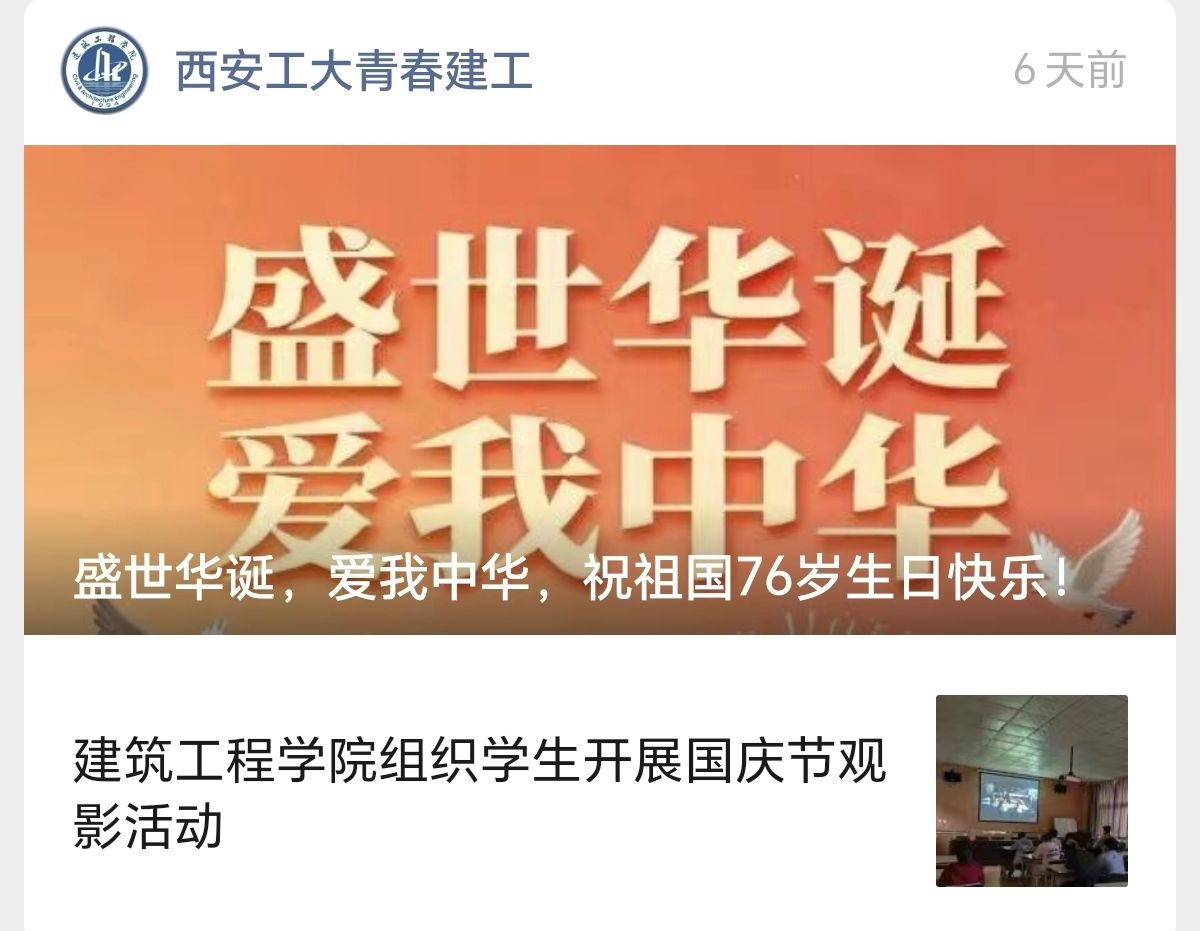于国庆期间依托“西安工大青春建工”微信公众号,正式推出“华诞传祝福”线上专题活动,汇聚全院师生对祖国的美好祝愿。