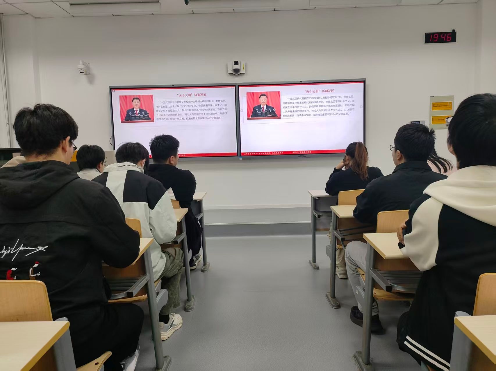 活动采用“集中学习+宿舍自主观看”相结合的形式推进:学院在教室组织多场集中学习会,同步鼓励学生利用课余时间在宿舍通过电子设备观看学习内容,确保全员参与、学习全覆盖;过程中,学生们认真观看、记录要点,围绕文化思想的时代价值展开了自发交流。