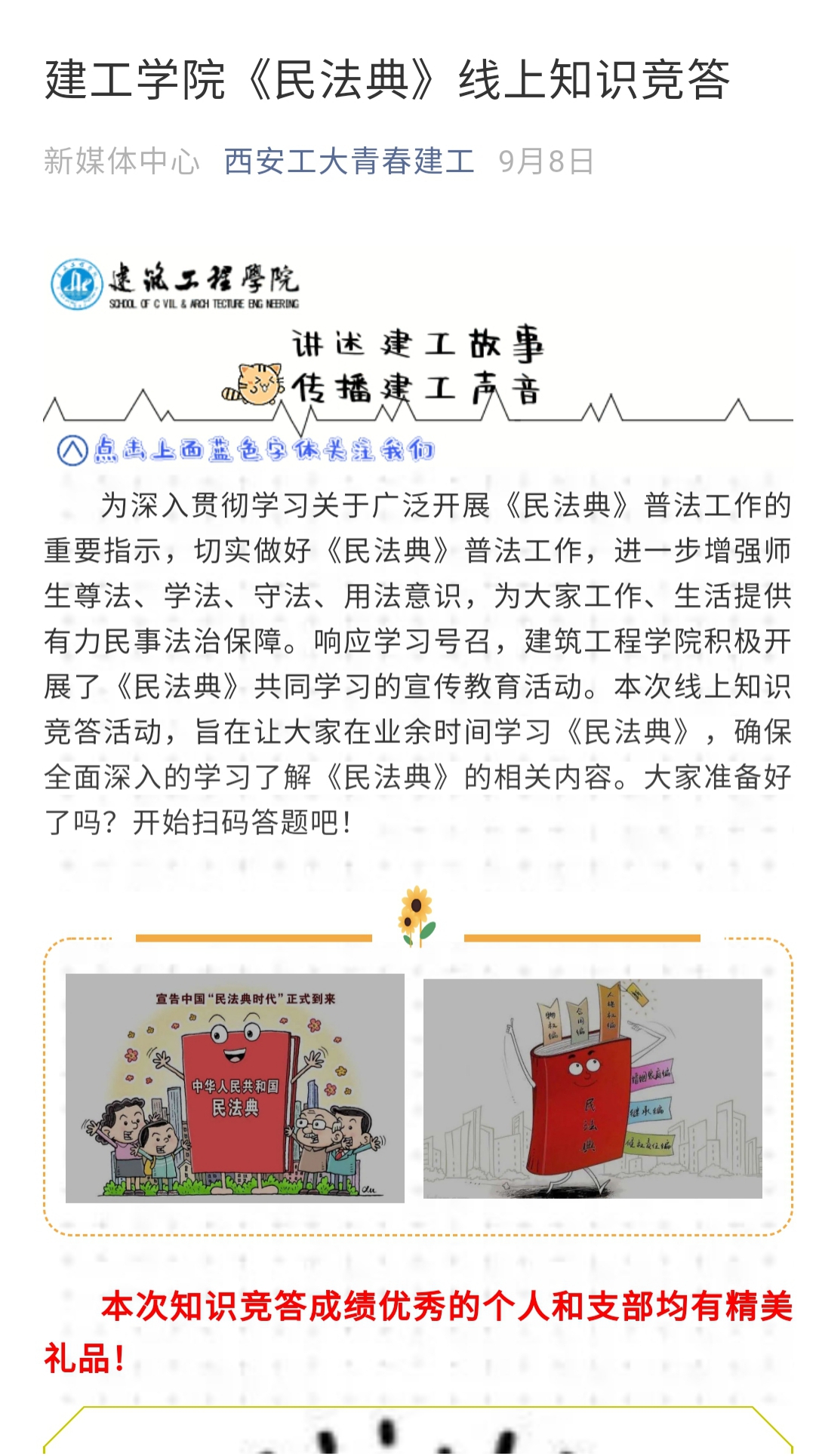 本次活动在学院党委的指导下,结合学院特色,由专人搜集了包括单选、多选和判断共40题,依托“西安工大青春建工”微信平台进行线上知识竞答。活动中,分工会小组广泛宣传动员,鼓励大家全面深入学习了解《民法典》的相关内容,占全院教师总人数85%的老师参与了本次活动,活动效果非常好。