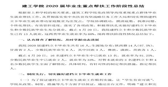 强化对建档立卡贫困家庭毕业生和其他就业困难群体毕业生的“一对一”帮扶。按照之前制定的学院就业困难群体帮扶方案,学院多方位联系用人单位、沟通学生意向,有针对性地开展就业岗位推荐工作,并进行线上“一对一”帮扶指导,保障了困难群体毕业生就业。疫情期间,1名建档立卡学生通过推荐顺利实现就业,目前学院建档立卡毕业生就业率已达82%。