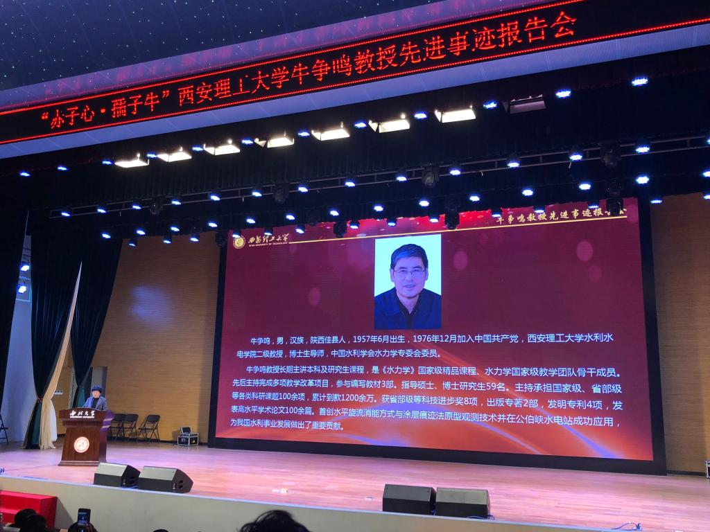 师生代表10人参加了在西北大学(长安校区)举办的“赤子心.孺子牛”牛争鸣教授先进事迹报告会。牛争鸣教授是西安理工大学水利水电学院博士生导师、二级教授、我国著名水利工程专家。牛教授在为本科生上完课后心脏病突发去世。