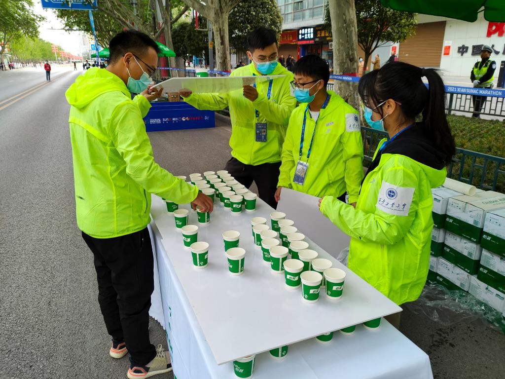 417日上午,2021西安国际马拉松比赛在西安永宁门广场鸣枪开跑,28000名选手从五湖四海而来,用脚步丈量这座城市,点燃古城西安的热情与活力。2021年恰逢全运年,参赛者步伐矫健,广大市民观赛热情,一场全民参与的西马,为十四运会营造了热烈的全民全运氛围。学院47名志愿者在35 Km补给站岗位服务本次比赛。