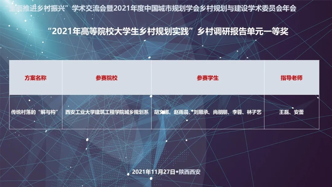 “全国大学生乡村规划竞赛”由中国城市规划学会乡村规划与建设学术委员会主办,自2017年起已成功举办5届,是国内目前唯一的全国性乡村规划类赛事。本次竞赛有728个团队参赛,最终乡村调研报告单元共有93份作品进入遴选,经层层筛选,最终评选结果为:一等奖1个、二等奖2个、三等奖3个、优胜奖4个,佳作奖20个。