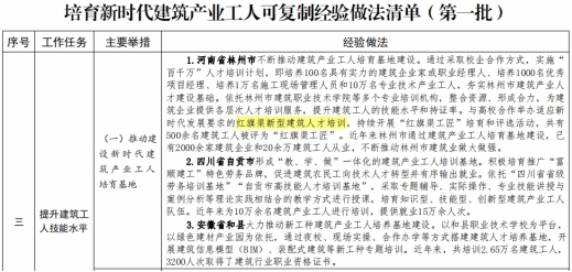 负责的“红旗渠新型建筑人才培训”经验做法,列入工作任务“提升建筑工人技能水平”的“推动建设新时代建筑产业工人培育基地”举措。