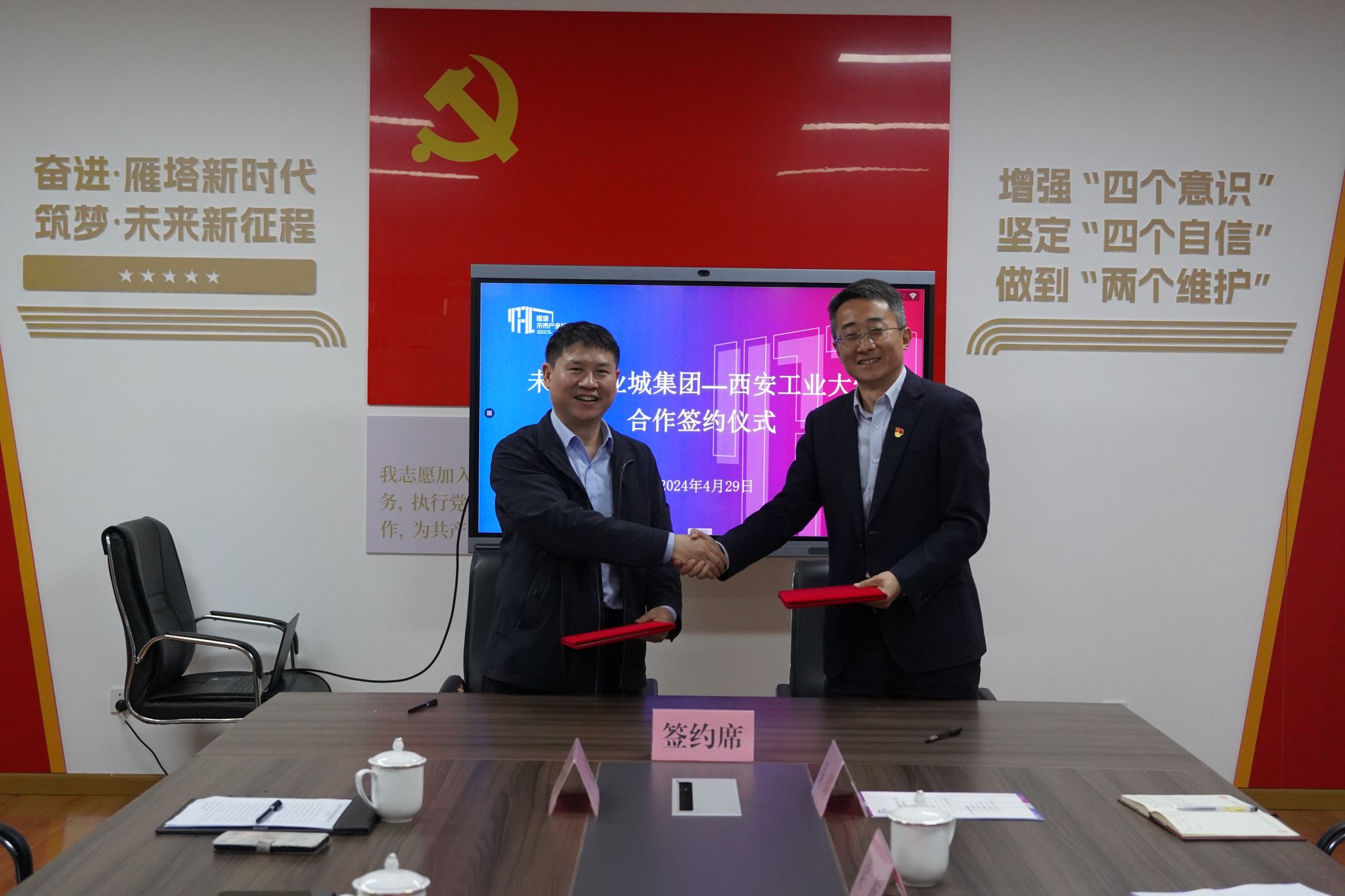 院长黄华、土木工程系主任李成华、城乡规划系主任杨大伟、城市地下空间工程系主任王亮以及智能建造系主任李养成一行5人前往西安未来产业城投资发展集团参加校企合作签约仪式。集团党委书记兼董事长左腾,集团总工程师李炳,综合部副部长鲁燕,人力资源部副部长钱靖和战略发展部副部长梁航出席了签约仪式。集团董事长左腾主持了签约仪式。