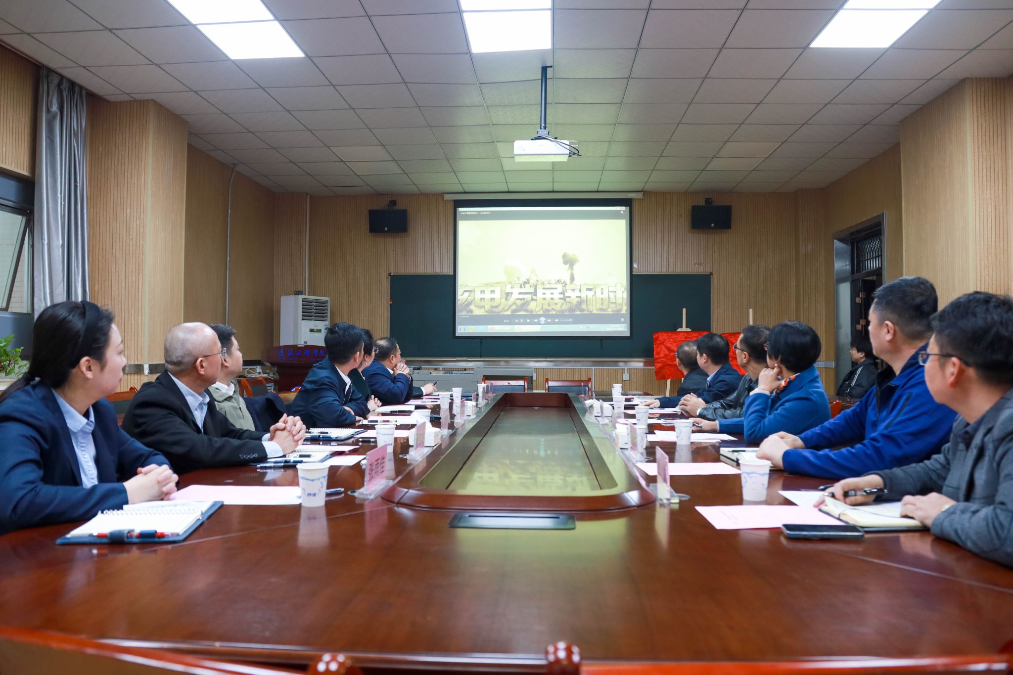 与会人员观看中国核工业中原建设有限公司宣传片,赵国兵详细介绍了公司发展历程、业务板块等,希望双方能够在科研合作、人才共育、学生培养等方面开展深入合作,期待建立长效合作机制,走出一条高科技、高效能、高质量的合作发展之路。黄华介绍了学院学科建设、科学研究、人才培养等方面的情况。双方围绕科技研发、人才培养等方面展开了深入交流讨论,最终达成发展共识。