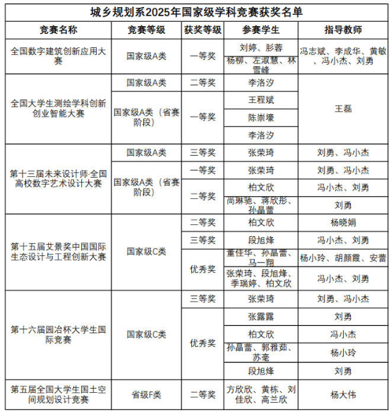 城乡规划系学子在2025年全国数字建筑创新应用大赛中获得全国一等奖两项;在2025年全国大学生测绘学科创新创业智能大赛中获得全国二等奖一项;在第十三届未来设计师·全国高校数字艺术设计大赛中获得全国三等奖一项,省赛一等奖一项,二等奖两项,冯小杰、刘勇被评为全国优秀指导教师和陕西赛区优秀指导教师;在艾景奖·第十五届中国国际生态设计与工程创新大赛中获得全国银奖一项、铜奖一项、优秀奖两项,刘勇被评为最佳指导教师;在第十六届园冶杯大学生国际竞赛中获得全国三等奖一项,优秀奖四项,91短视频
