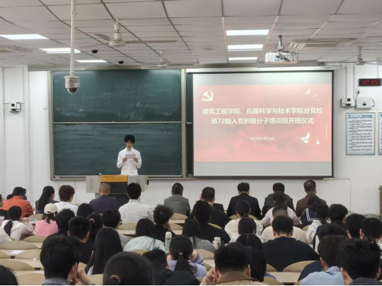 、兵器科学与技术学院分党校举办第72期入党积极分子培训班开班仪式。建工学院党委书记王守民、副书记张治宏,兵器学院党委书记蔡长龙、副书记梁伟樯及建工学院各学生党支部书记出席仪式,培训班170余名学员参加本次活动。