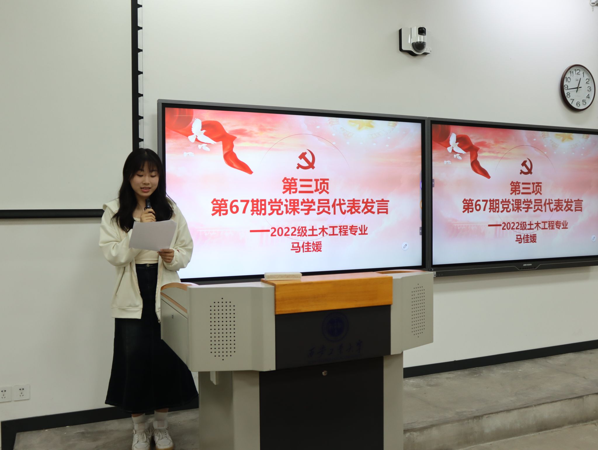 马佳媛代表新一期的培训成员做发言。她表示党课不仅仅是一门课程,更是一次政治洗礼。她表明了她参加本次党课的态度和决心,希望所有学员都可以秉持这种学习态度,作为一名共产主义事业的拥护者,应该认识到入党不仅仅是一种荣誉,更是一种责任。勉励大家珍惜此次难得的学习机会,用实际行动积极向党组织靠拢,争取早日成为一名合格的共产党员。