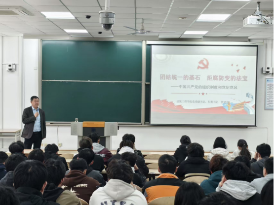 、兵器科学与技术学院分党校第71期积极分子培训班第六次理论授课在教1-101如期开展。建筑工程学院党委副书记贾建利老师以“团结统一的基石,拒腐防变的法宝——中国共产党的组织制度和党纪党风”为题,为全体学员带来了一堂深刻且生动的党课。