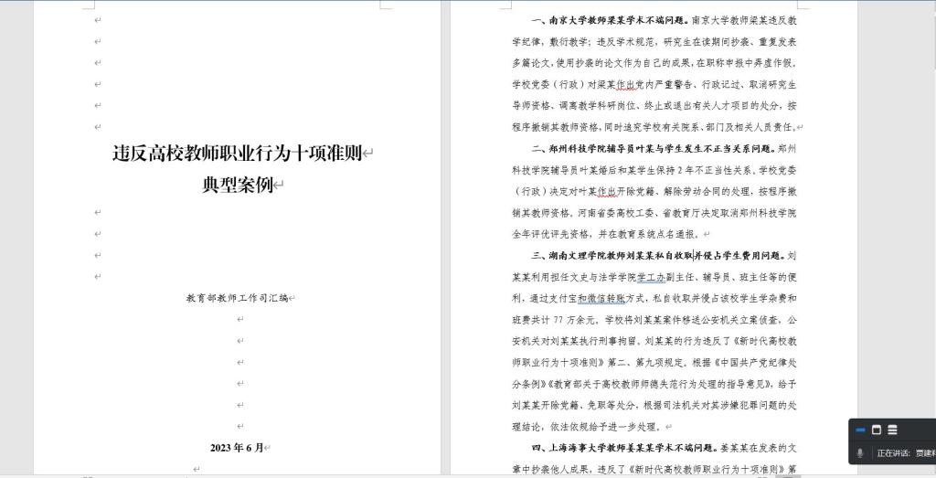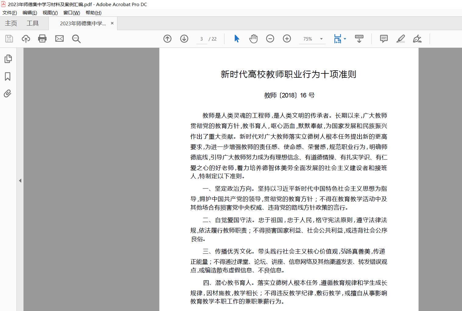 会上,大家集中学习了《违反高校教师职业行为十项准则典型案例》《新时代高校教师职业行为十项准则》《91短视频