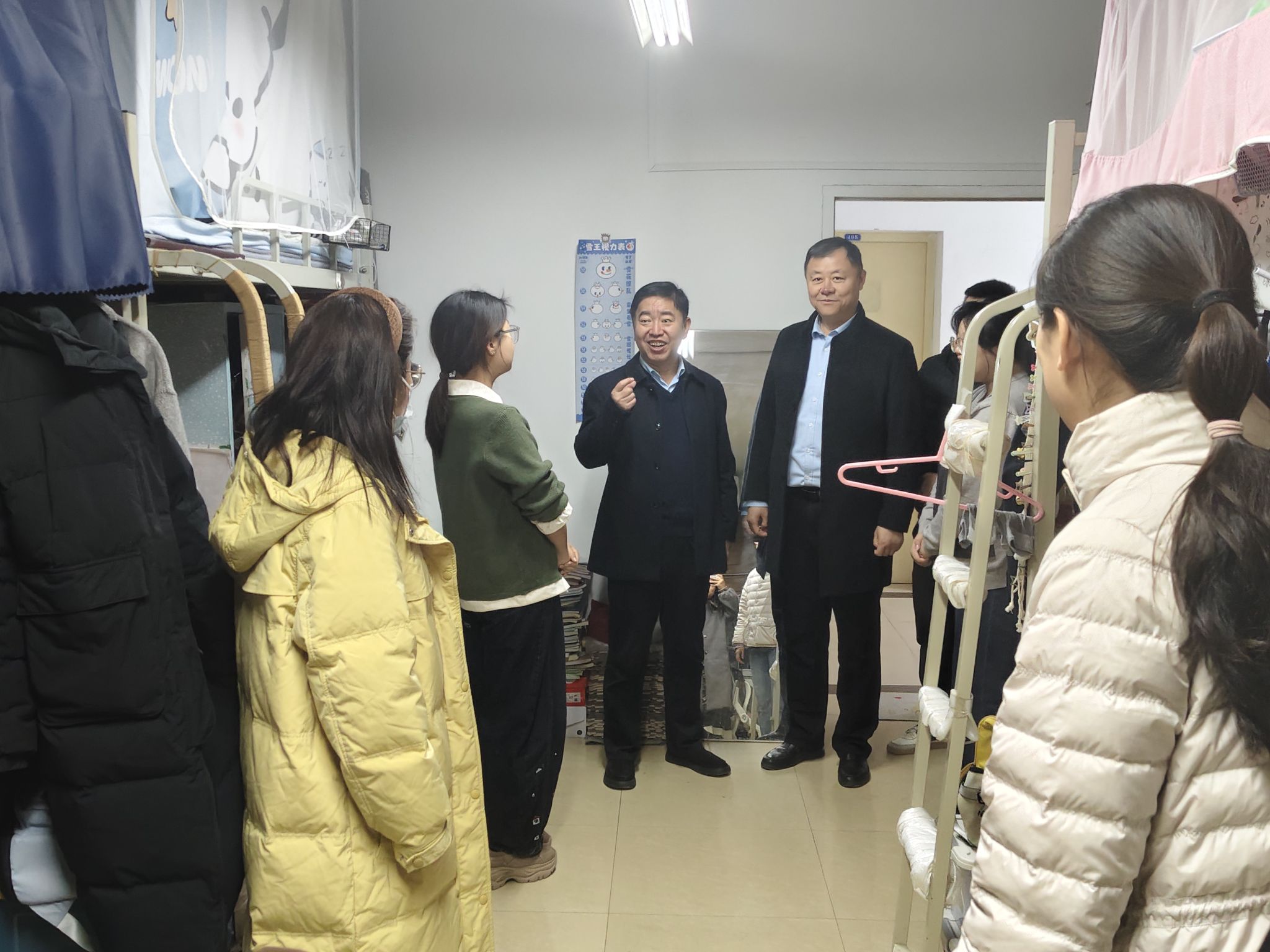 党委书记王守民、党委副书记贾建利带领全体辅导员深入学生宿舍,为学子们送去冬日关怀与问候,旨在深入了解学生在校学习生活状况,进一步加强宿舍安全管理,营造文明、和谐、安全的宿舍环境。