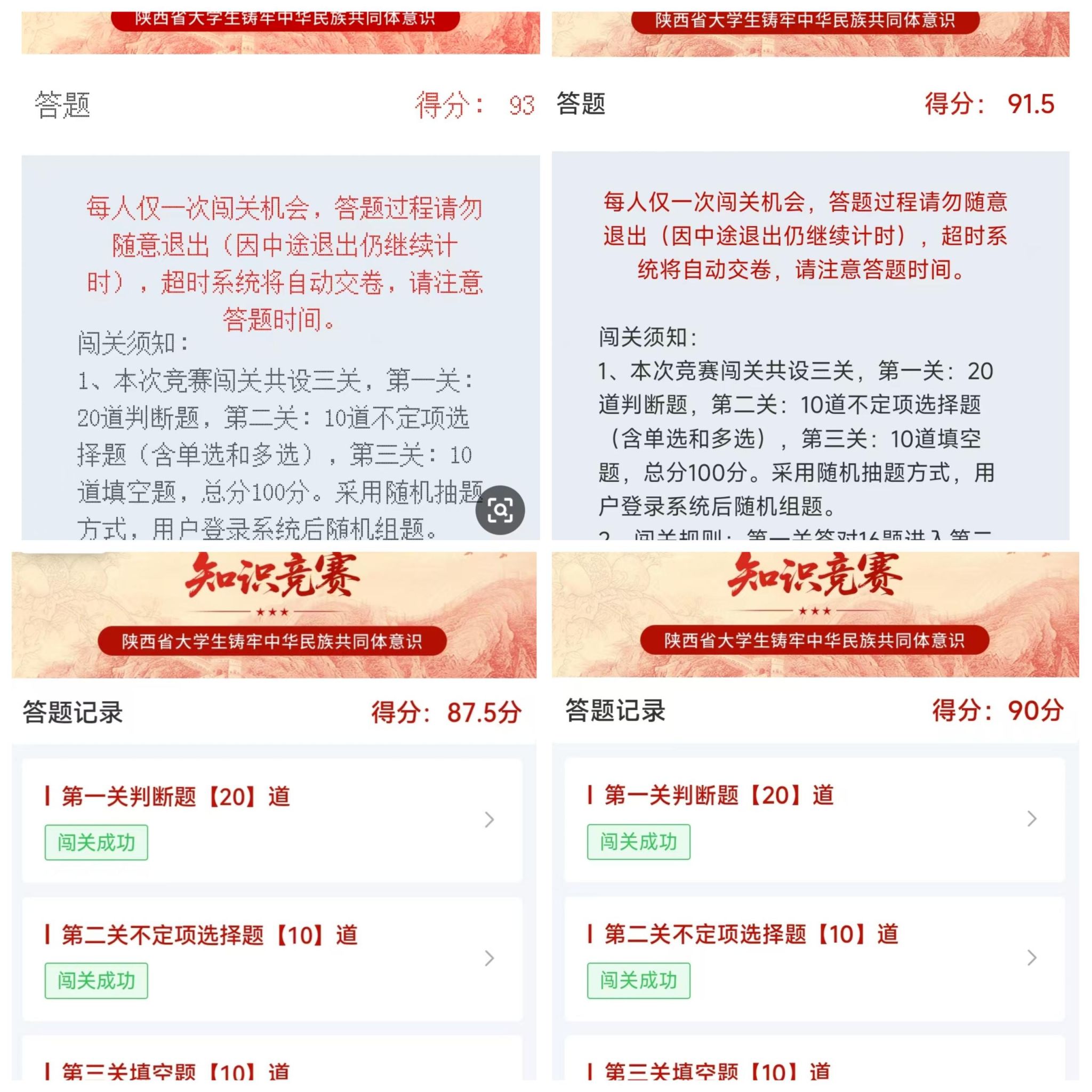 本次竞赛以线上答题形式开展,题目围绕宪法知识与铸牢中华民族共同体意识相关内容设置,分为判断题、不定项选择题、填空题三个关卡,采用随机抽题组卷方式,且对各关卡答题时长与通关条件作出明确规定。答题过程中,同学们在教4-201集中参与,专注审题、认真作答,展现出良好的学习态度与知识储备。最终,参赛学生均顺利完成各关卡答题,取得了较为理想的成绩。
